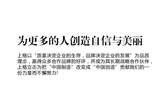 • 上格一路走來(lái),以“締造時(shí)尚集團(tuán),使公司受人尊敬,令人向往;為客戶提升價(jià)值,創(chuàng)造成功;讓員工提高生活品質(zhì),實(shí)現(xiàn)自我價(jià)值”作為我們的目標(biāo),“為更多的創(chuàng)造自信與美麗” 作為我們的使命,立志為把“中國(guó)制造” 改變成“中國(guó)創(chuàng)造”貢獻(xiàn)我們的一份力量而不懈努力!